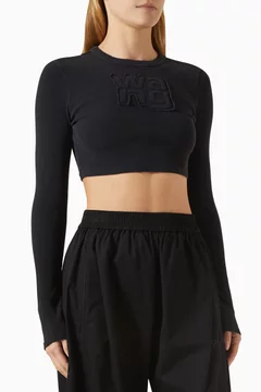 احصلي على إطلالة عصرية أنيقة مع تي شيرت اليكسندر وانغ. تي المصنوع من مزيج قطن مسامي بقصة قصيرة يمكن تنسيقها مع ملابس بخصر مرتفع أو منخفض. ويمكن ارتداؤه مع بنطال بقصة فضفاضة لإطلالة مستوحاة من أزياء الشارع.
